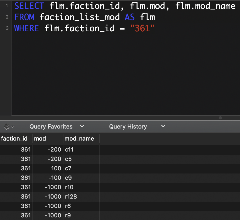 Above we see a rather cryptic list of modifiers to faction 361 - Ashen Order. Note that in the mod_name column, we see the Classes to be modified (c11, c5, c7, c9) as well as the Races to be modified (r10, r128, r6, r9), and their corresponding modifier values in the 'mod' column.