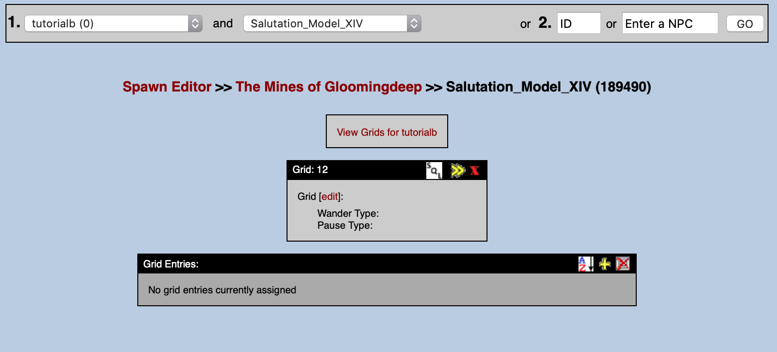 The Pathing Grid has Wander types, Pause types, and a listing of Waypoints that your NPC will follow. To review the Grid fields in your database, reference the grid page (opens new window) in the Database Schema documentation. For information regarding the Waypoint entry fields in your database, reference the grid_entries page (opens new window).