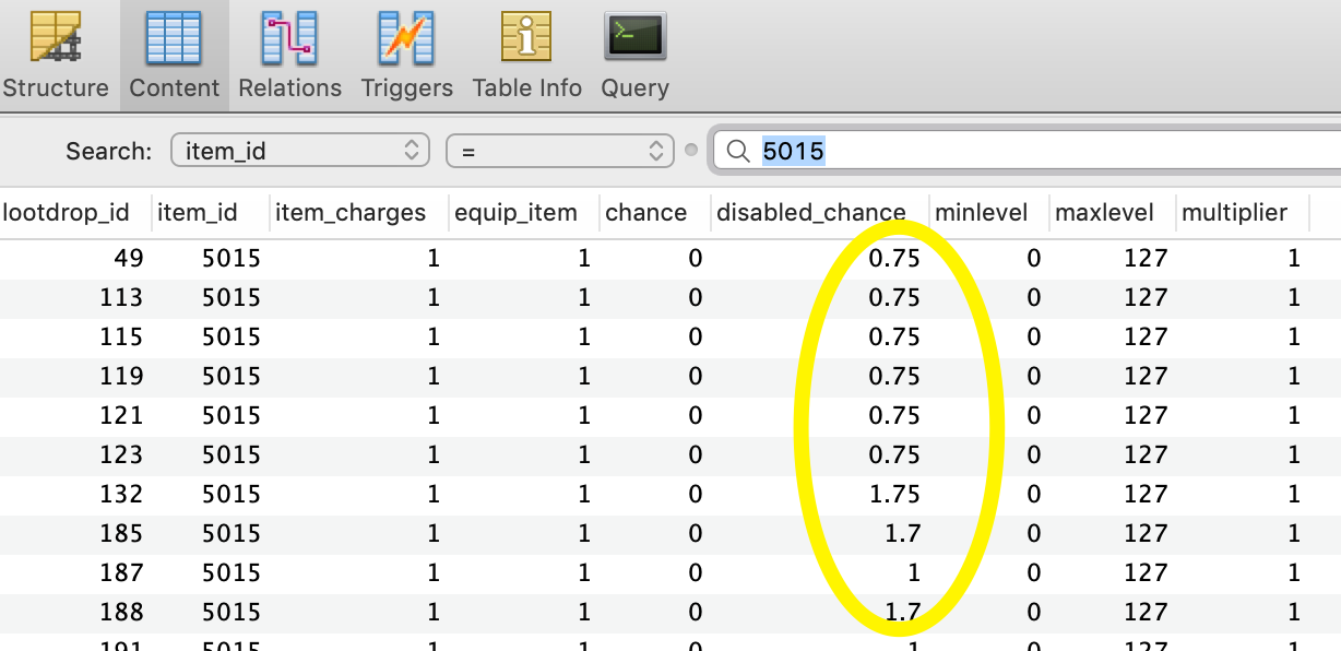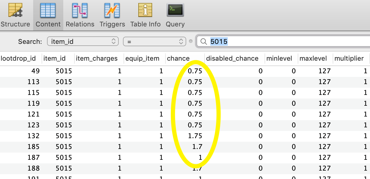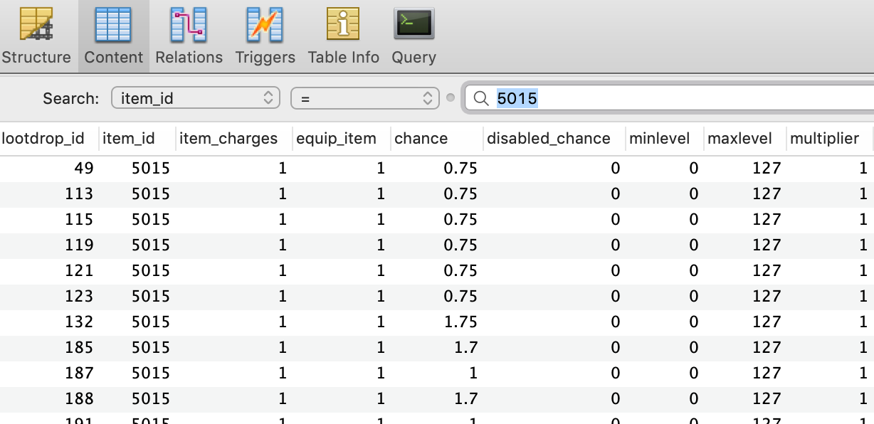 First, let's take a look at our database to see the item listed in its corresponding lootdrop_entries. Notice the "chance" column, which is used to set the probability of the item dropping when the NPC is killed.